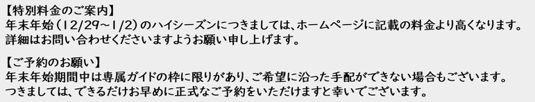 【キャンセルについて】 キャンセルなさる場合、必ず、ツアー出発日7日前までにご連絡お願い致します。事前連絡がない場合は、キャンセルチャージが100%かかりますのでご注意ください。 尚、キャンセル日はお客様が弊社へ営業日、営業時間内にご連絡をいただいた日となります。土日、祝日、営業時間外でのご連絡の場合は、休み明けまたは翌日がキャンセル日となります。予めご理解、ご了承ください。 |