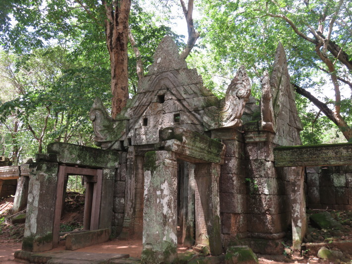 シェムリアップからコーケー方面に向かうと、まず初めに森の中に現れるスポットがコチラ。プラサットプラムというレンガの祠堂。大樹の根が絡まり合う光景は圧巻です。第3の世界遺産サンボ―プレイクック遺跡群ではいくつか見られますが、コーケー遺跡群の中ではこの遺跡のみゆえ、見逃すまじ!