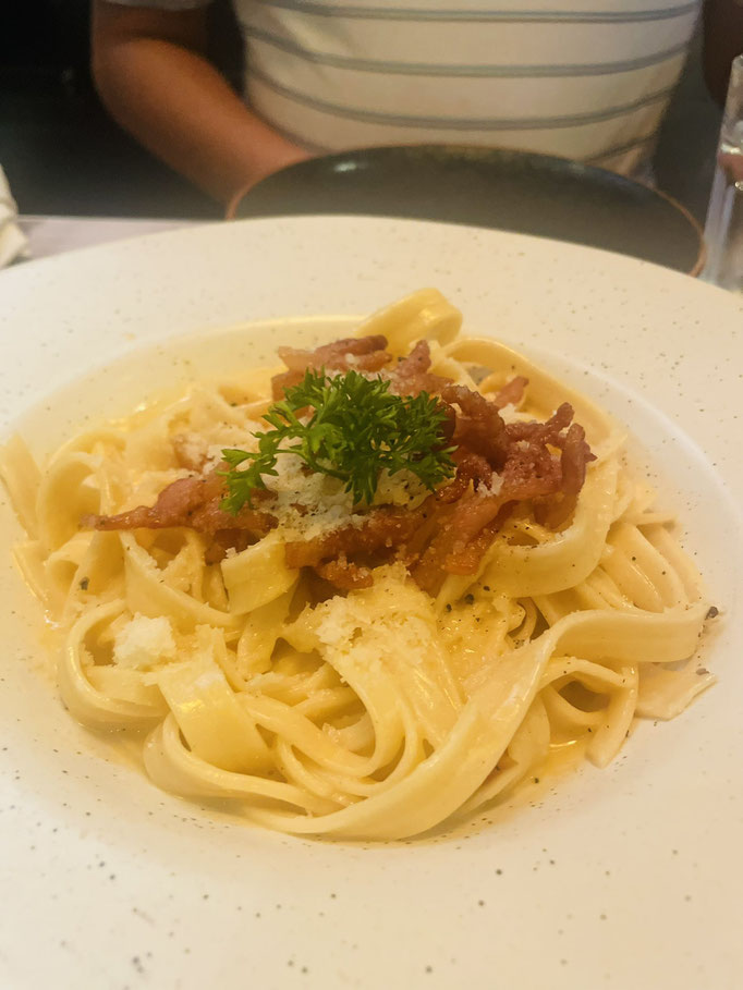 \新規開拓/カンダールビレッジ近くのイタリアン🇮🇹比較的短期間で店舗が変わる場所。この界隈に来たらいつもはマンマ一択だがこの日はちょっぴり冒険でコチラへ。ふかふかのパン生地風ピザがボリューミー且つ美味。カルボナーラも◎🙆♀️珍しくデザートまで手を出した夜。